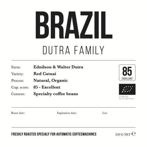 L'origine du café 'Specialty' de la Dutra Family est, comme indiqué précédemment, le Brésil. Les frères Ednilson et Walter Dutra sont les agriculteurs qui veillent à ce que ces grains aient la saveur délicieuse qu'ils ont. Pour ce faire, ils utilisent une méthode naturelle et biologique. Cette méthode est née en Éthiopie en raison d'un manque d'eau, et est également connue sous le nom de méthode sèche. Elle consiste à laisser sécher les baies entières sur des lits, ce qui prend environ 25 jours. Ces lits sont strictement surveillés et retournés à intervalles réguliers. Lorsque la fève sèche avec tout ce qu'elle contient de pulpe, il se produit un processus de fermentation qui fait ressortir les sucres naturels et les arômes fruités. Il en résulte un café corsé au goût intensément sucré.