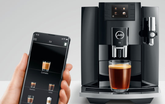 Faites fonctionner votre machine à café JURA à l’aide de votre smartphone. Mais n’oubliez pas de placer une tasse sous l’unité d’écoulement ! Vous pouvez aussi mettre le refroidisseur de lait en communication avec la machine afin que cette dernière sache toujours quelle quantité de lait il contient.