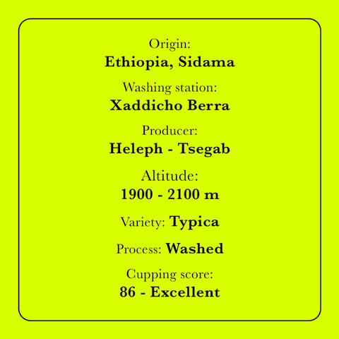 L'origine du Specialty Coffee Heleph Tsegab, comme mentionné ci-dessus, est le Sidama en Éthiopie. Ce Specialty Coffee est obtenu par la méthode du lavage. La méthode de lavage, également connue sous le nom de méthode humide, consiste à laver les baies jusqu'à ce que la pulpe soit complètement éliminée. Cette opération est effectuée le plus tôt possible après la cueillette, les grains faisant ensuite l'objet d'un processus de sélection distinct. Les agriculteurs font suivre aux haricots un canal d'eau, où les baies mûres et non mûres sont séparées par une sélection flottante. Les baies mûres coulent, car elles sont mûres et de meilleure qualité. Ensuite, les grains sont étalés sur des lits où ils sèchent. Les cafés lavés ont une saveur très nette, tous les délicieux arômes de l'origine sont bien mis en valeur par ce processus. Il en résulte un café vif et frais, avec une légère acidité et un soupçon d'arômes sucrés et floraux.